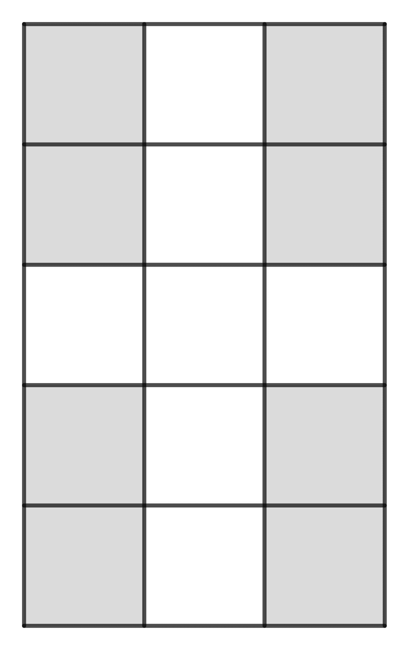 Pintu ruang pertemuan terdiri dari 2 panel dengan tinggi $\text{5 m}$ yang bisa terbuka keluar. Pintu tersebut ditempeli stiker berwarna abu-abu dan putih, yang masing-masing berukuran $\text{10 cm} \times \text{10 cm}$ berselang-seling dengan pola seperti pada gambar berikut.