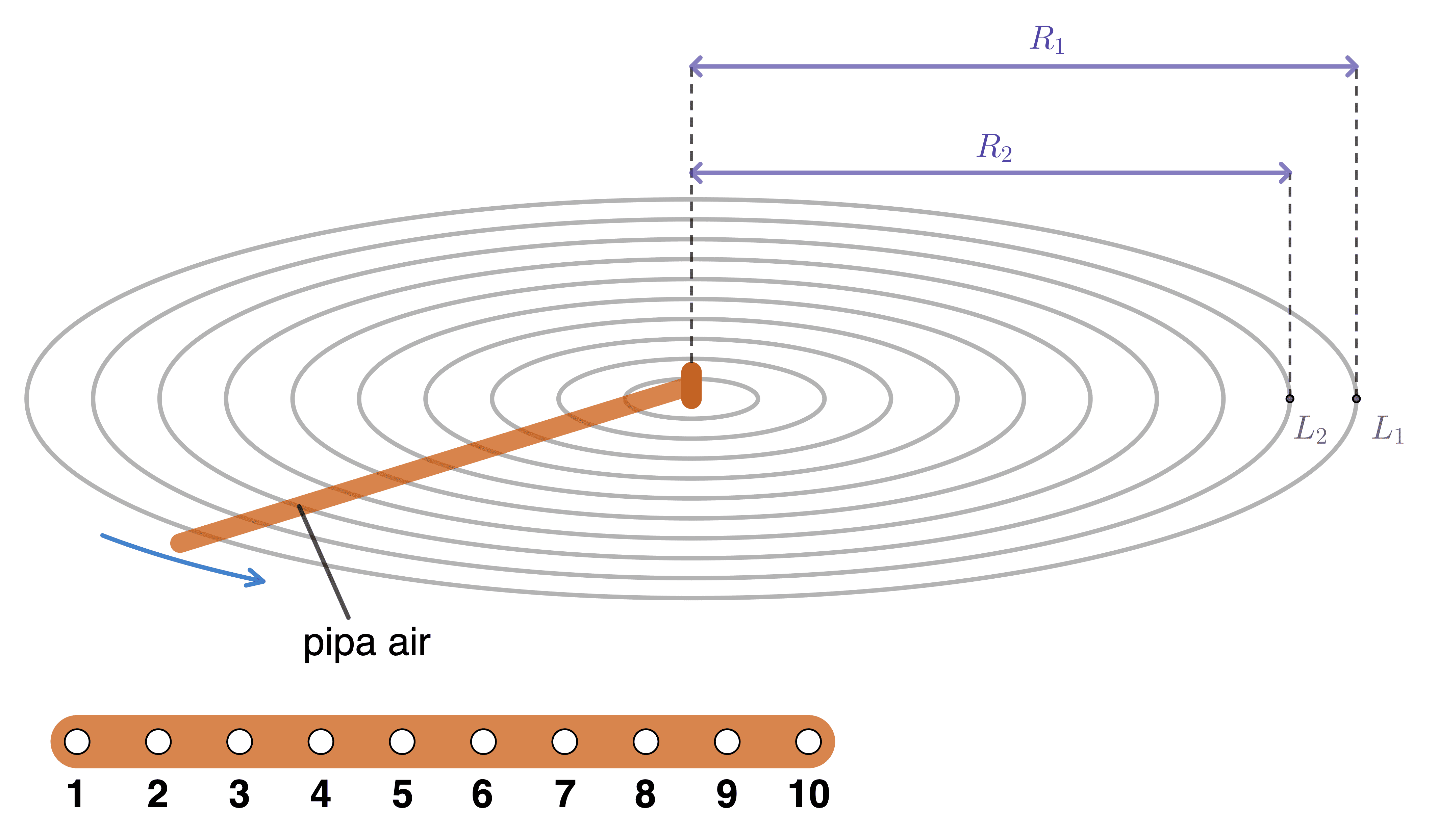 Pada lingkaran paling luar ($L_1$), tanaman ditanam sepanjang lingkaran dengan radius $R_1$ meter. Petani menyirami tanaman dengan air melalui pipa air yang berputar sesuai dengan arah panah. Pada pipa air terdapat lubang air. Lubang air nomor 1 mengairi tanaman pada lingkaran $L_1$ dengan radius $R_1$, dan seterusnya.