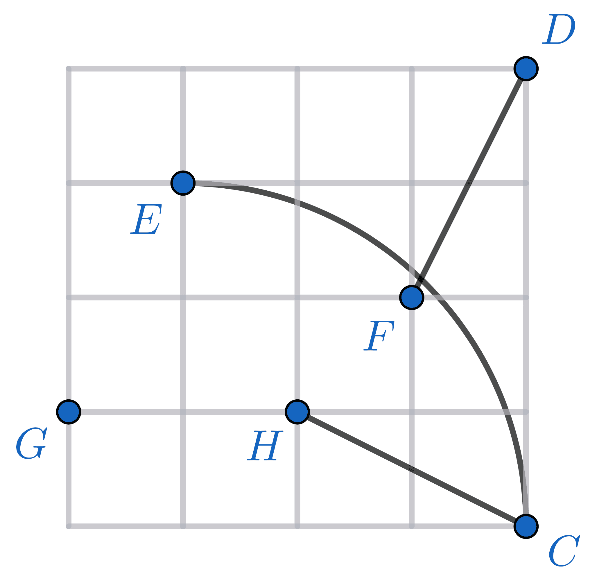 Gambar di bawah adalah peta dari beberapa kecamatan di Kota Damai. Jarak Kecamatan D ke C adalah $\pu{40 km}$. Terdapat jalan tol berbentuk seperempat lingkaran yang menghubungkan Kecamatan E dan C. Lebih lanjut, terdapat jalan tol lurus yang menghubungkan Kecamatan D dan F, serta C dan H.