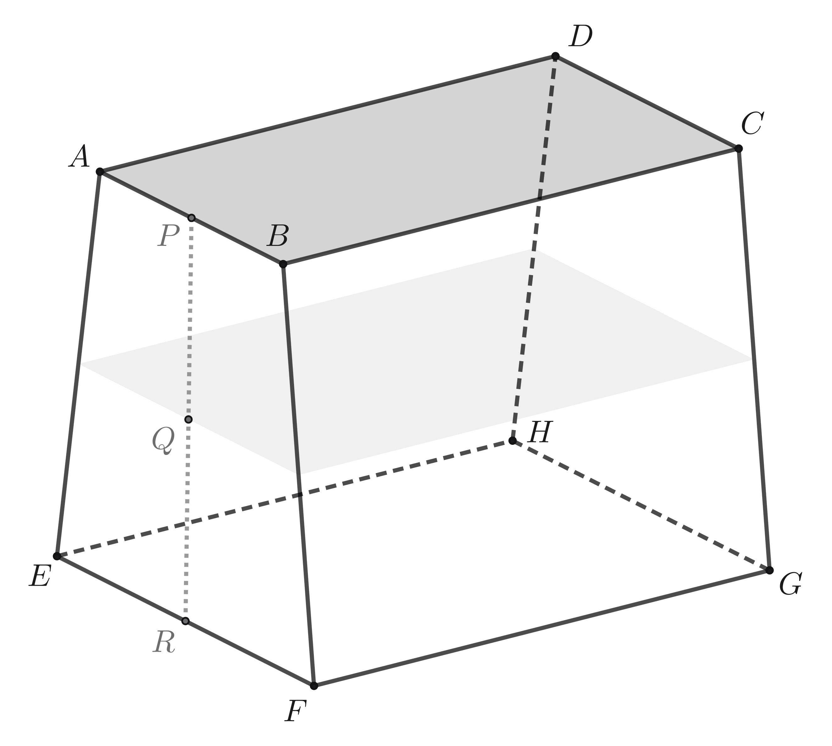 Penampang vertikal tangki merupakan trapesium dengan $\overline{EF}$ sejajar $\overline{AB}$, $EF = \pu{20 cm}$, $AB = \pu{10 cm}$, dan tinggi $PR = \pu{20 cm}$. Penampang mendatar tangki merupakan persegi panjang. Diketahui $FG= BC = \pu{40 cm}$.