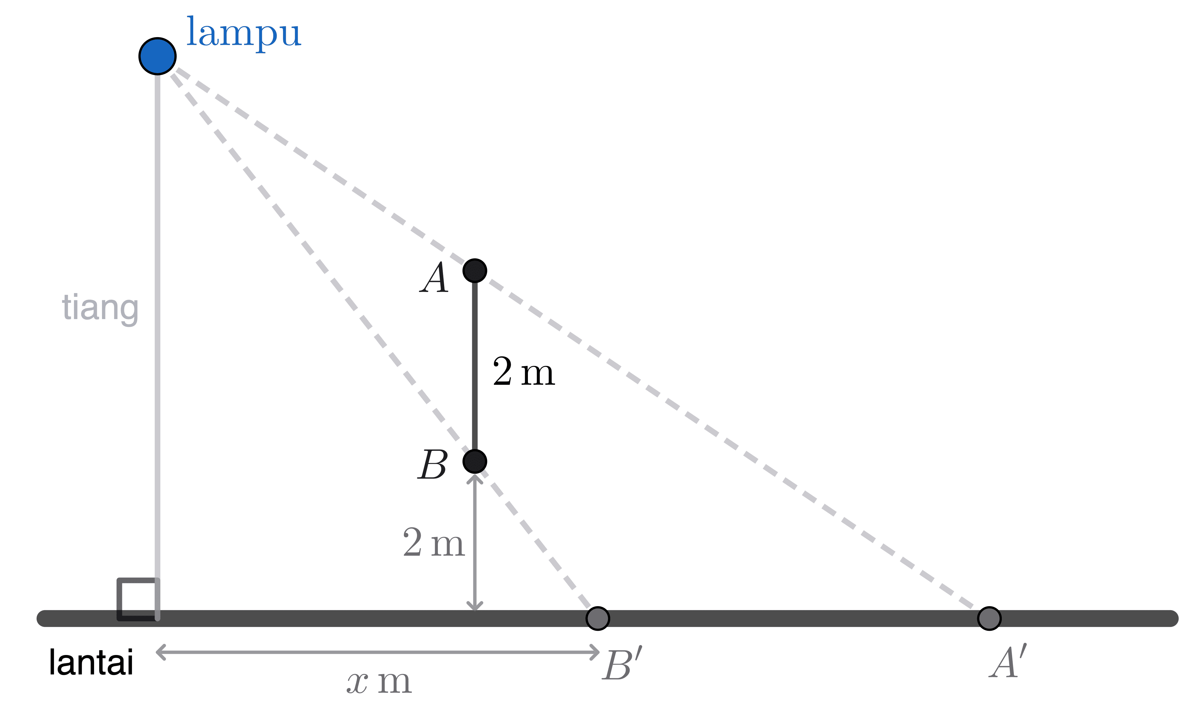 Gambar di atas merupakan pembentukan bayangan benda $AB$ di lantai oleh lampu yang dipasang di atas tiang. Bayangan yang terbentuk adalah $A'B'$. Diketahui $x = \pu{3 m}$ dan jarak $A'$ ke tiang adalah $\pu{6 m}$.