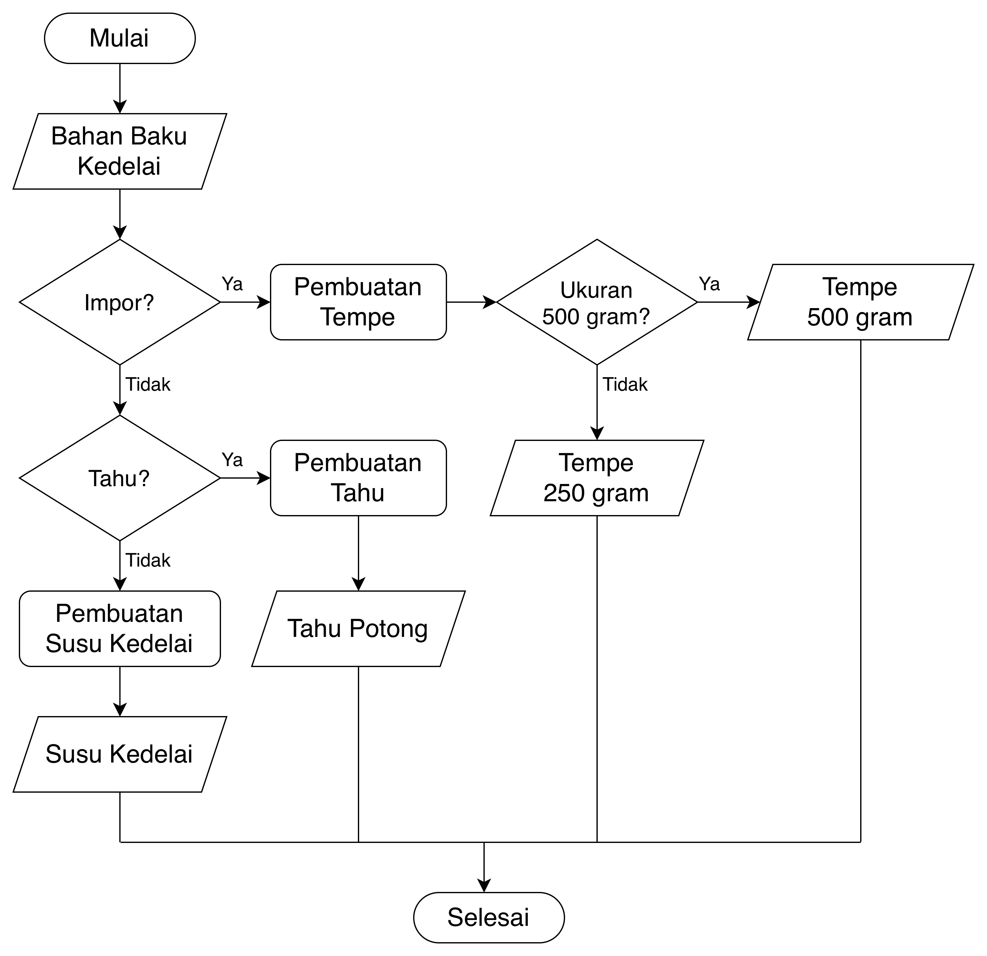 Sejumlah 50% bahan baku kedelai merupakan produk nonimpor dan 60% diantaranya digunakan untuk pembuatan tahu. Setiap 1 kg kedelai akan menghasilkan 3 bungkus tempe dengan ukuran 500 gram atau 6 bungkus tempe ukuran 250 gram. Adapun 1 kg dapat menghasilkan 10 liter susu kedelai.