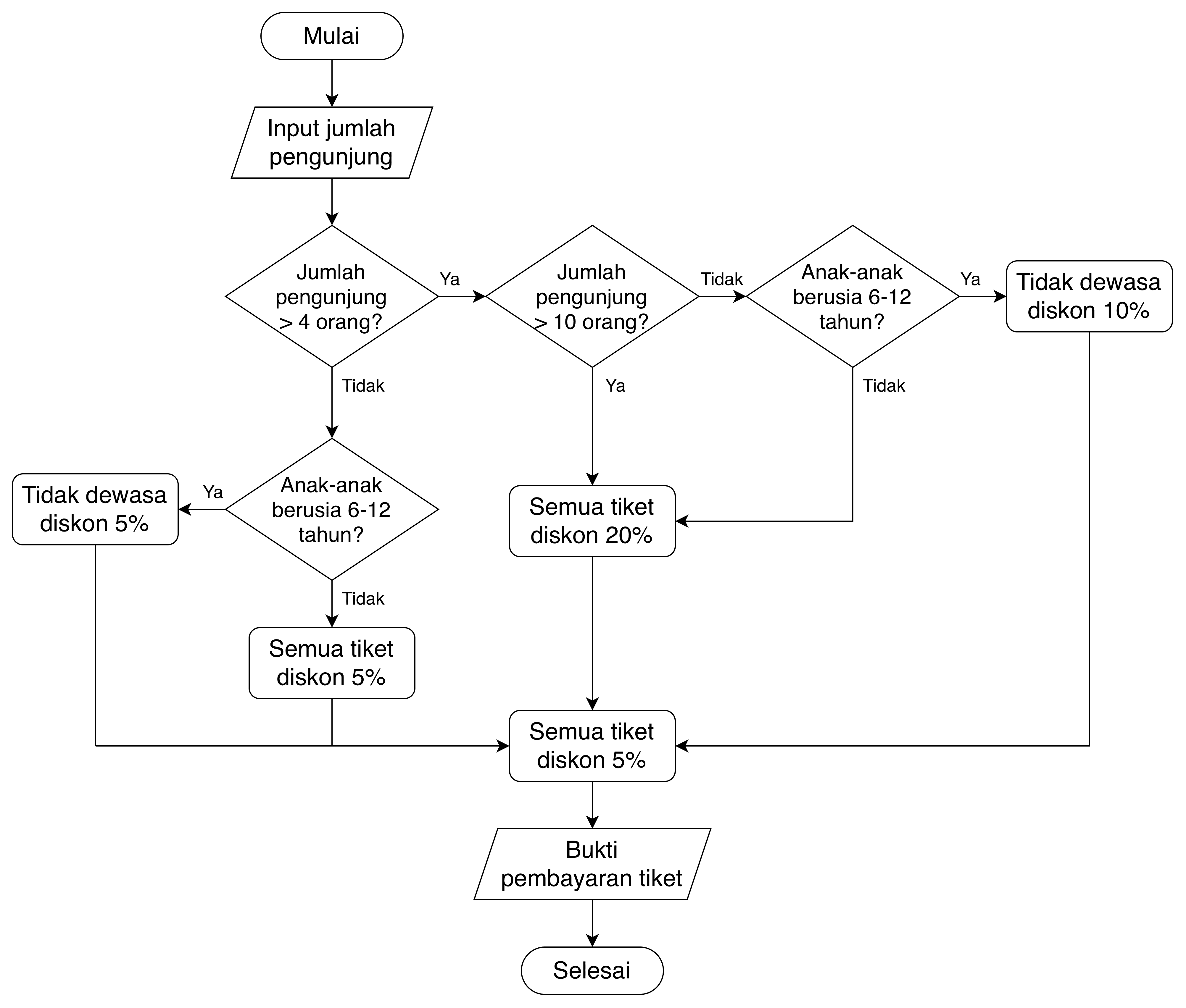Dalam rangka menarik pengunjung, suatu taman bermain di Kota Khayangan melakukan promosi dengan memberikan beberapa diskon (lihat diagram alir). Setiap hari 50% pengunjung adalah orang dewasa. Informasi mengenai jumlah pengunjung dalam 3 hari di akhir pekan disajikan pada tabel berikut.