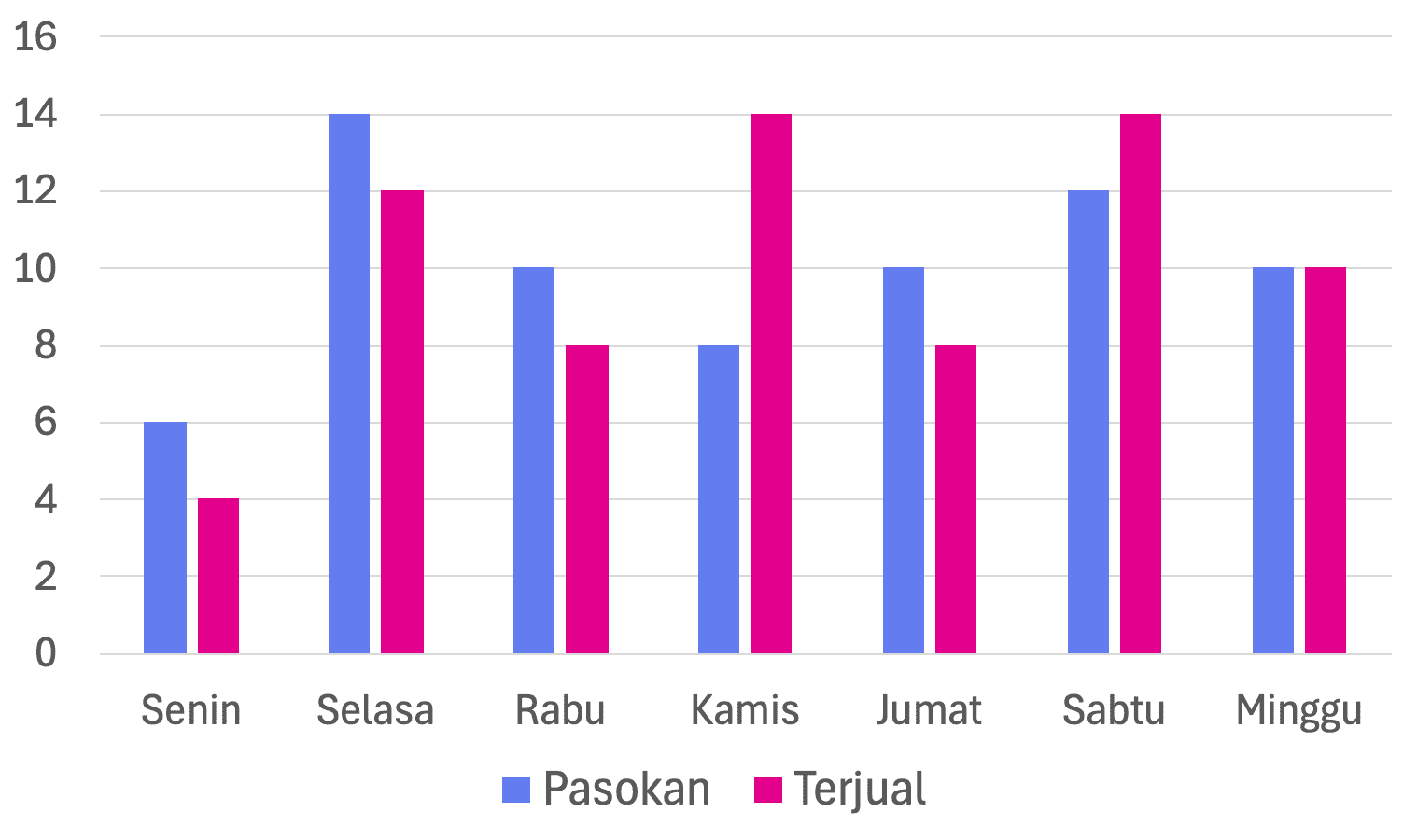 Pada suatu grosir kelontong, dijual sembilan bahan pokok makanan. Salah satu barang yang dijual oleh pedagang grosir tersebut adalah gula pasir (dalam satuan kuintal). Data pasokan dan yang terjual tiap hari dalam satu minggu disajikan dalam diagram berikut.