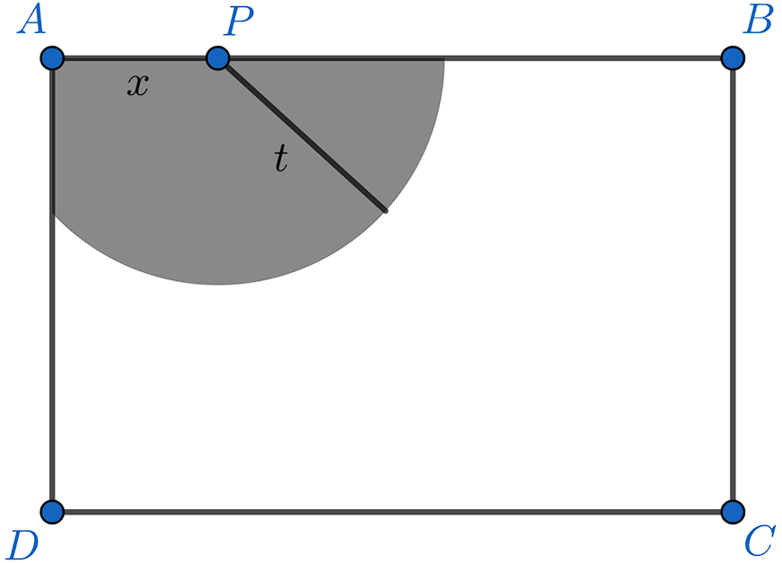 Kambing ditempatkan dalam kandang pada suatu halaman yang penuh rumput. Kandang tersebut berbentuk persegi panjang $ABCD$ dengan panjang $AB = \pu{12 m}$ dan lebar $AD = \pu{9 m}$. Kambing ditambatkan pada dinding $AB$ dengan tali yang panjangnya $t$ meter. Pangkal tali ditambatkan pada dinding $AB$ di titik $P$ yang berjarak $x$ meter dari titik sudut $A$.