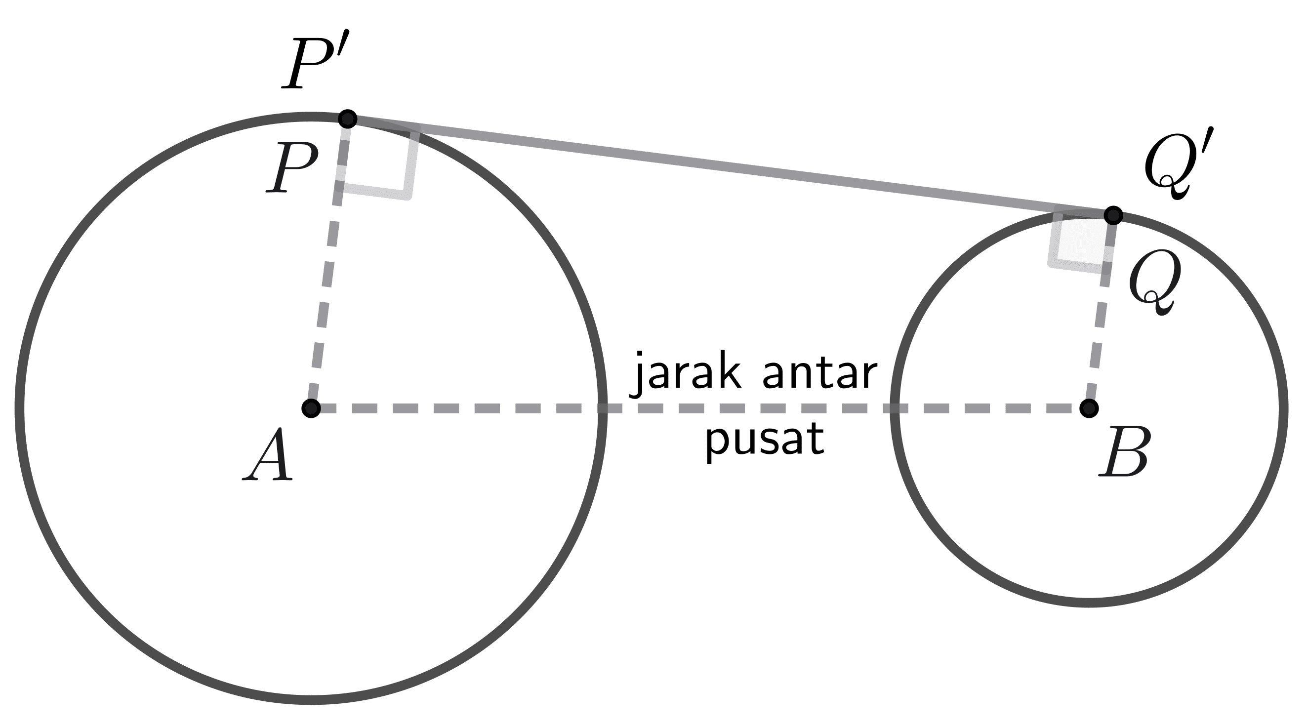Titik $P$ dan $Q$ masing-masing berada pada permukaan roda, sedangkan $P'$ dan $Q'$ berada pada permukaan sabuk. Pada mulanya, posisi $P$ dan $P'$ sama, demikian juga dengan posisi $Q$ dan $Q'$.