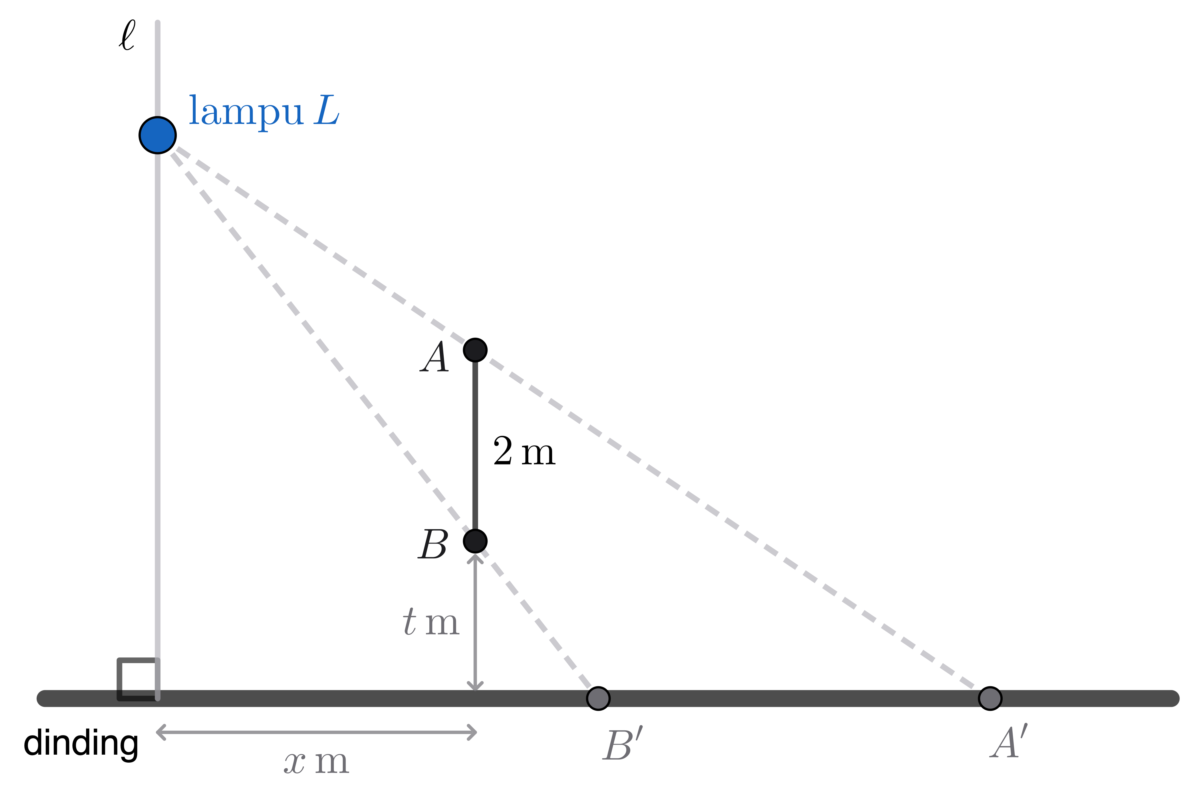 Diketahui $t = \text{2 m}$ dan $x = \text{3 m}$, dan jarak $A'$ ke garis $\ell$ adalah $\text{6 m}$. Jarak lampu $L$ ke dinding adalah ... m.
