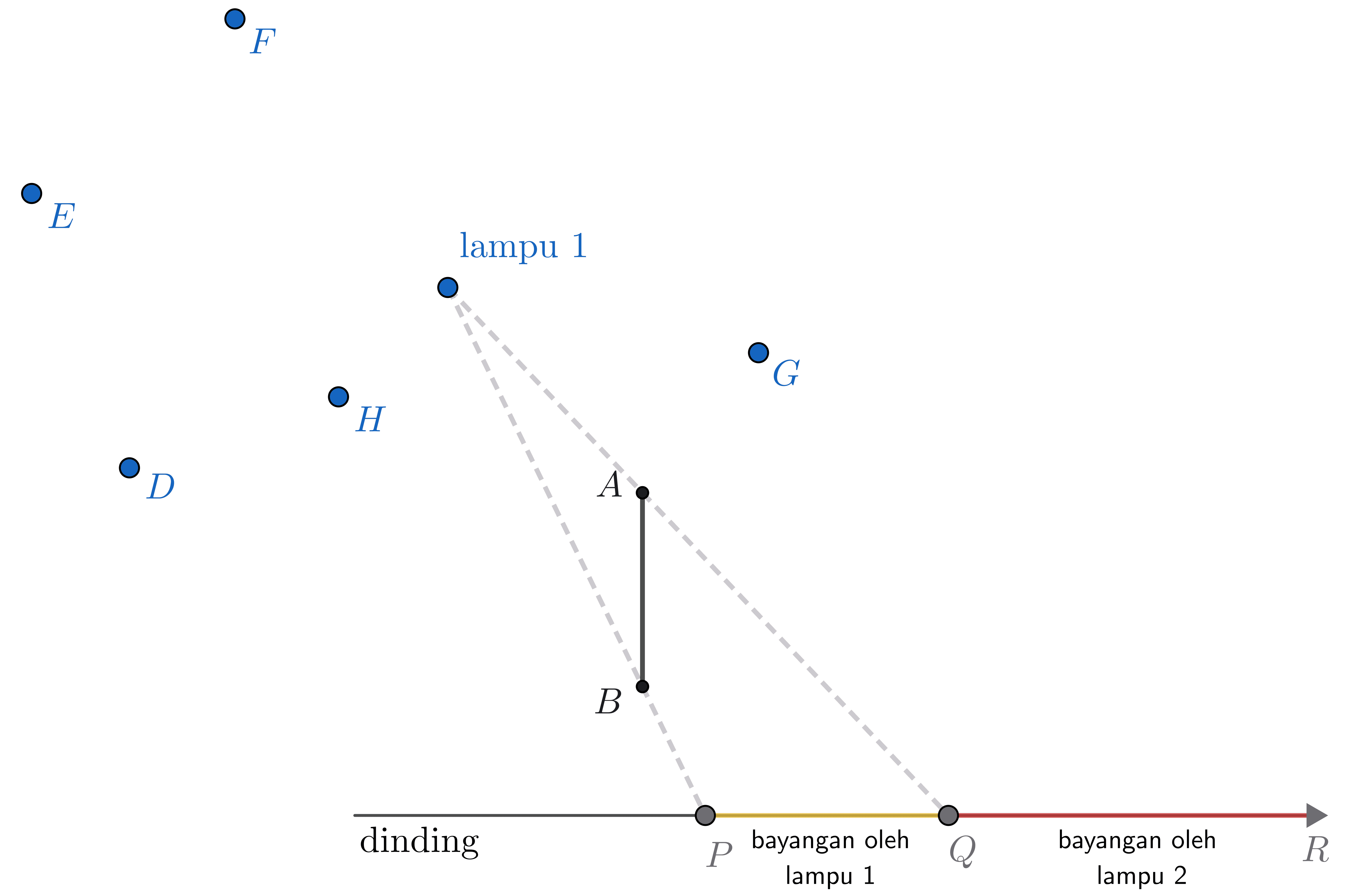 Untuk keperluan tertentu, ditambahkan lampu kedua. Jika $PQ$ adalah bayangan tembok oleh lampu 1 dan $QR$ adalah bayangan tembok oleh lampu 2, posisi yang mungkin untuk lampu 2 adalah di titik ...
