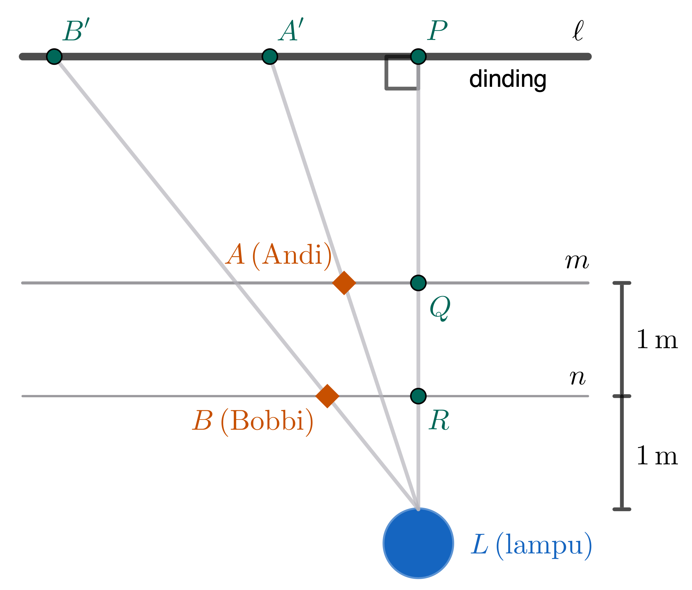 Garis $m$ dan $n$ sejajar dengan dinding. Andi berjalan sepanjang garis $m$, sedangkan Bobbi berjalan sepanjang garis $n$ dengan arah yang sama. Di titik $L$, terdapat lampu yang terpasang tidak terlalu tinggi sehingga bayangan Andi dan Bobbi mencapai dinding, yakni $A'$ dan $B'$.