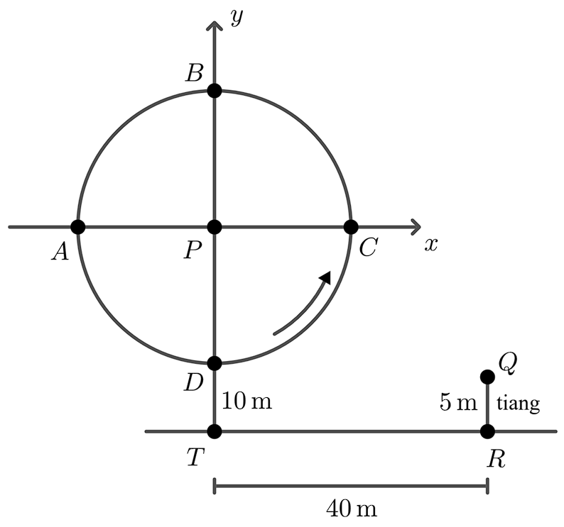 Sebuah bianglala (ferris wheel) bertitik pusat $P(0, 0)$. Titik $P$ berada pada ketinggian 35 meter dari permukaan tanah. Setiap penumpang bianglala naik dari titik terbawah, yaitu titik $D$. Dalam waktu 5 menit, setiap penumpang bianglala telah menjalani lintasan sepanjang $\dfrac{125}{4}\pi$ meter. Sebuah lampu dipasang pada suatu titik di bianglala.