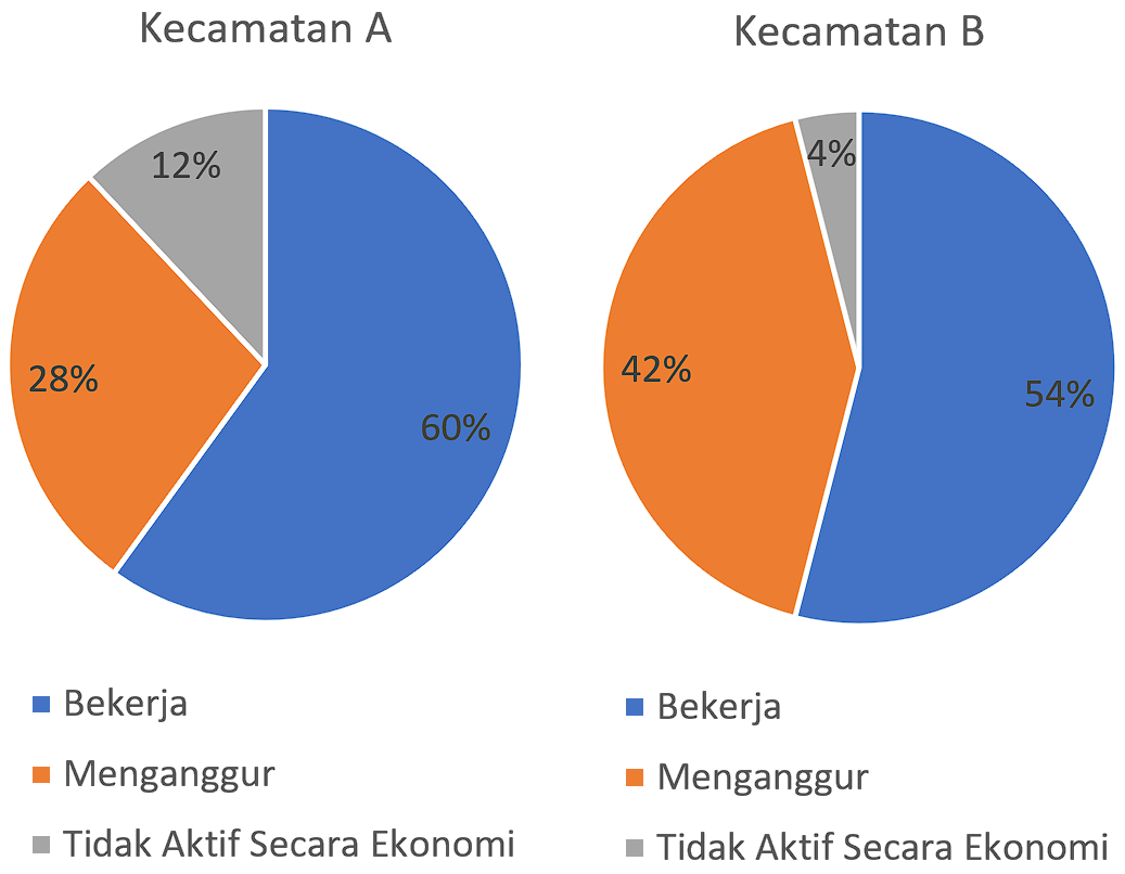 Diagram berikut menampilkan data mengenai populasi angkatan kerja di dua kecamatan, yaitu A dan B, pada tahun 2022 berdasarkan status bekerja, menganggur, dan tidak aktif secara ekonomi.