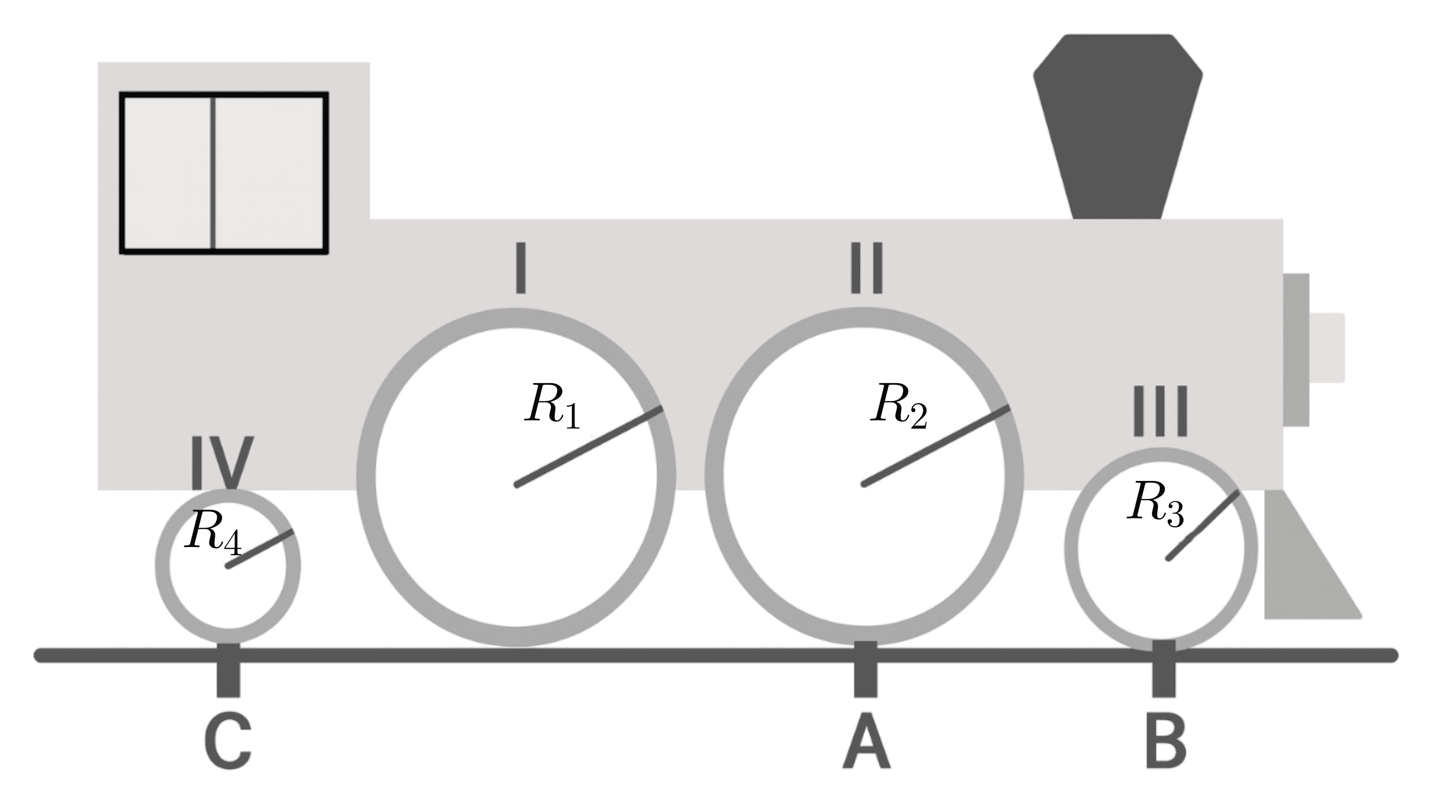 Gambar berikut merupakan kereta api yang memiliki roda dengan jari-jari $R_1 = R_2 \ne R_3 \ne R_4$. Terdapat titik $A$, $B$, dan $C$ berturut-turut pada tepi roda dengan jari-jari $R_2$, $R_3$, dan $R_4$.