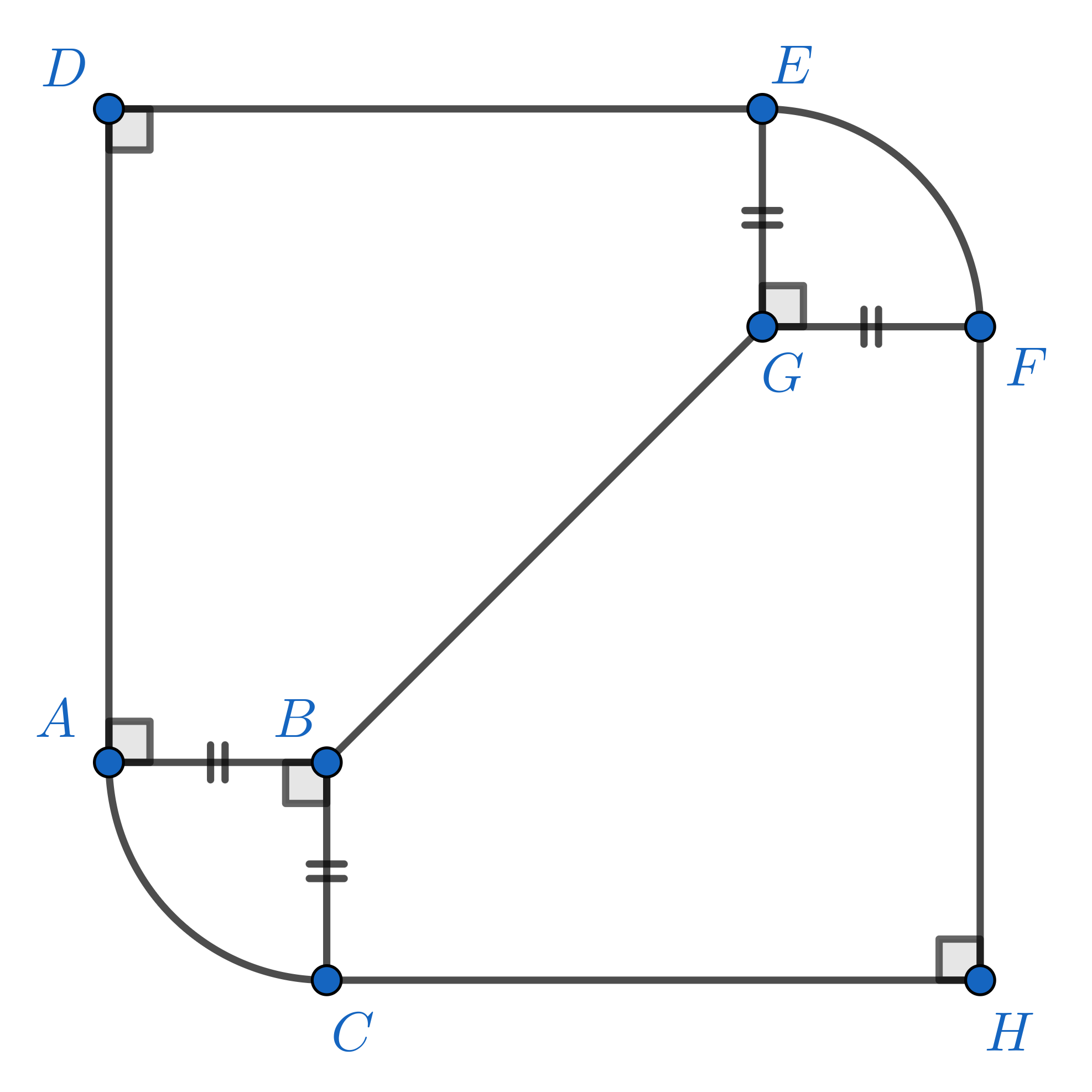 Gambar di bawah adalah peta dari beberapa kecamatan di Kota Damai. Jarak Kecamatan D ke C adalah $\pu{40 km}$. Terdapat jalan tol berbentuk seperempat lingkaran yang menghubungkan Kecamatan E dan C. Lebih lanjut, terdapat jalan tol lurus yang menghubungkan Kecamatan D dan F, serta C dan H.