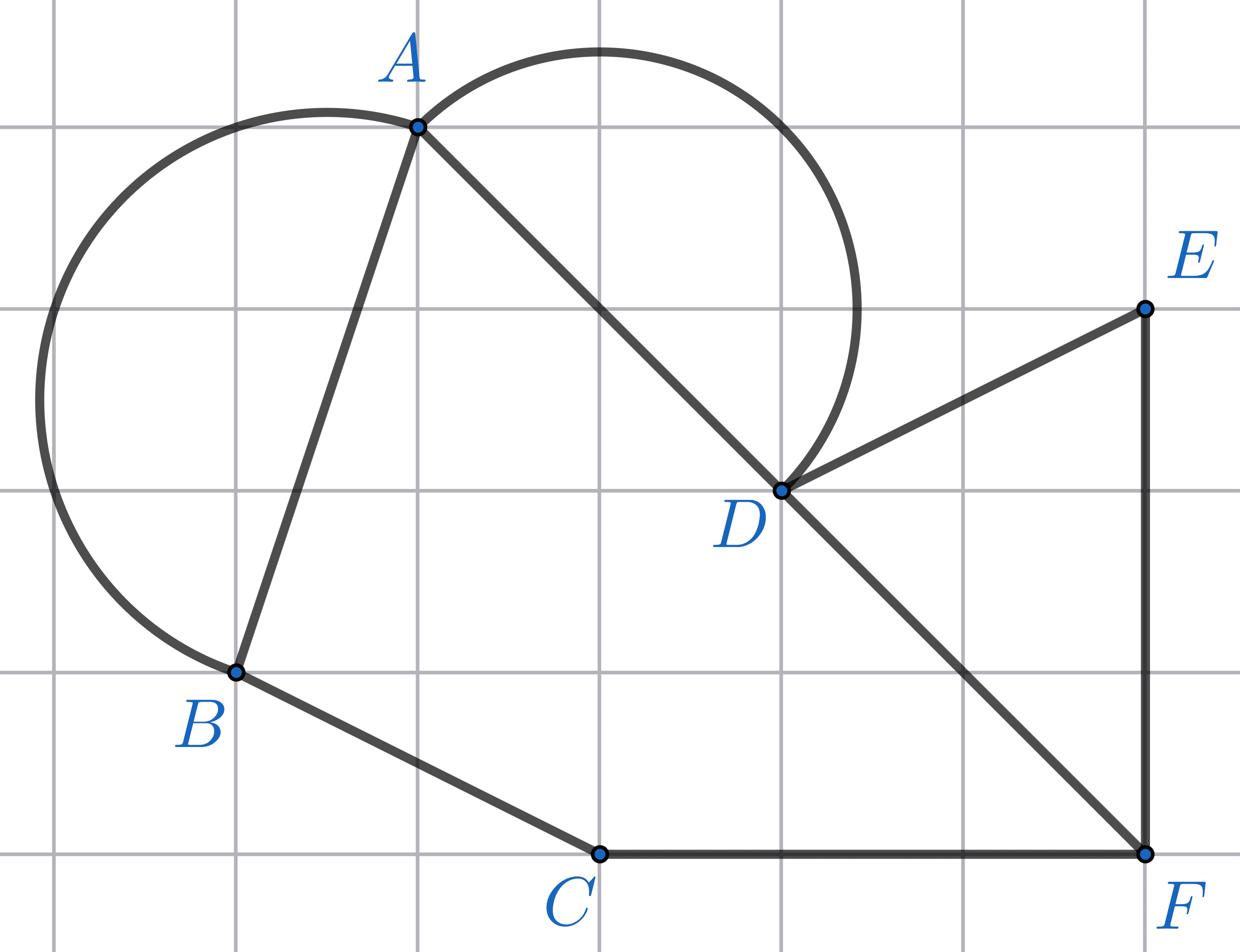 Jarak Kota C dan Kota F adalah $\pu{120 km}$. Jalan melingkar yang menghubungkan Kota A dan Kota B, serta Kota A dan Kota D berbentuk setengah lingkaran dan merupakan jalan tol.