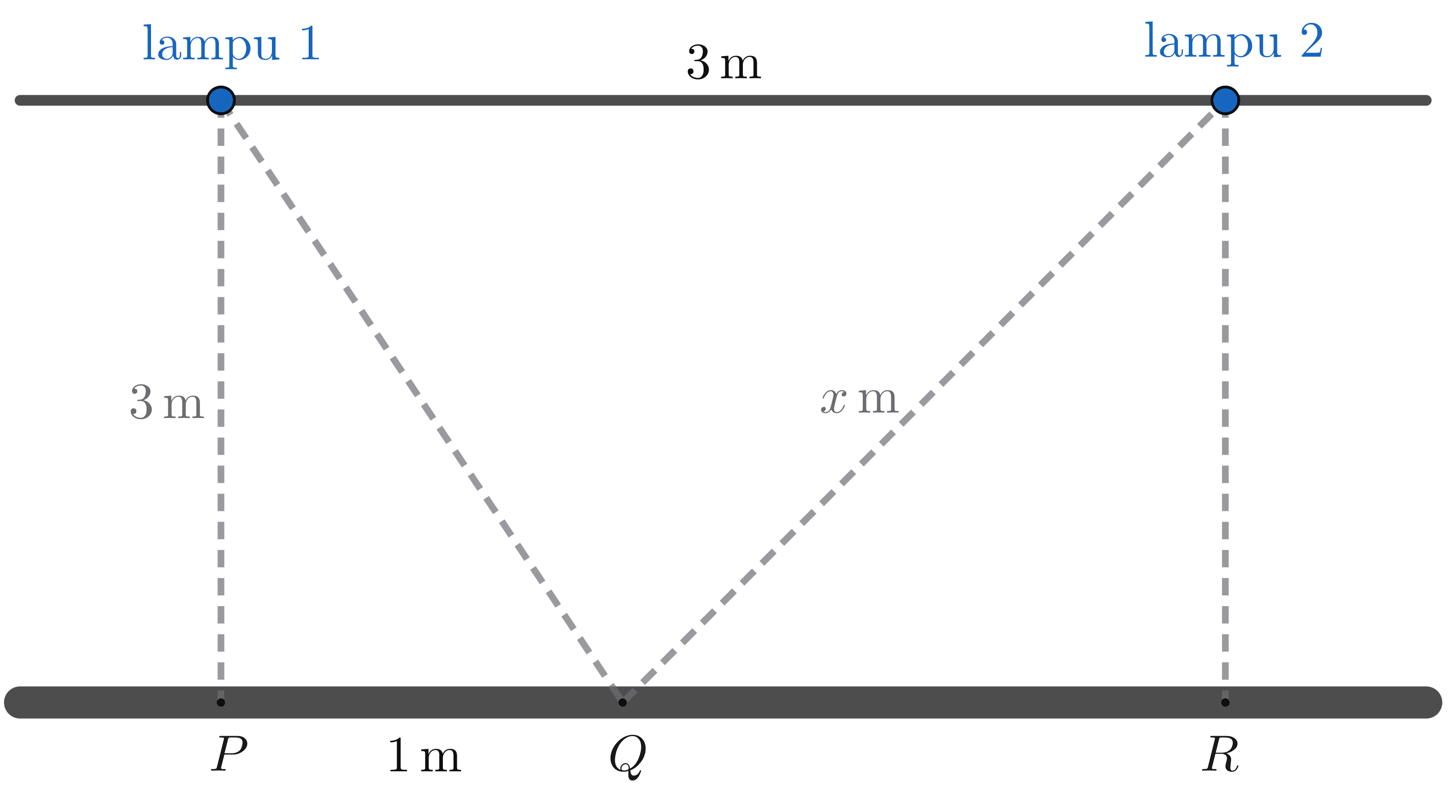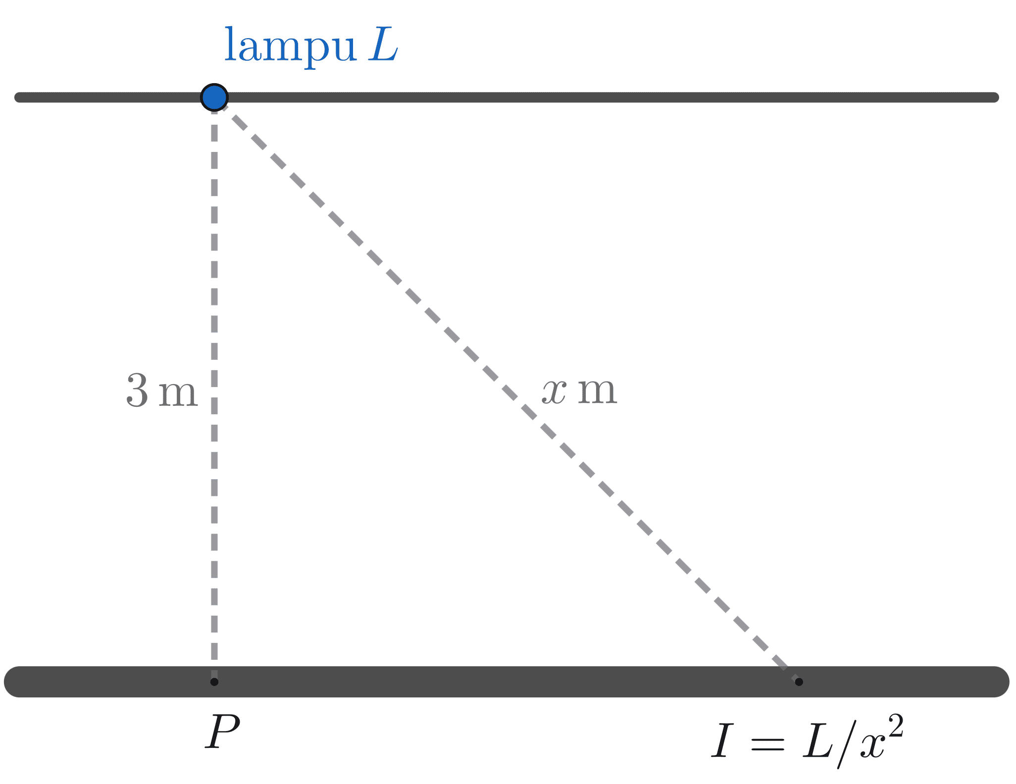 Intensitas suatu lampu pada titik tertentu ditentukan oleh daya lampu dan jarak titik ke lampu tersebut. Diketahui daya lampu tersebut adalah $L$ watt. Intensitas cahaya dari lampu tersebut pada suatu titik berjarak $x$ meter dari lampu adalah $I = \dfrac{L}{x^2}$. Pada langit-langit ruangan terpasang lampu. Tinggi ruangan tersebut adalah 3 meter.