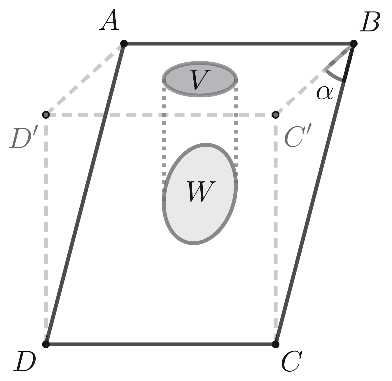 Butir hujan diasumsikan berbentuk bola sempurna dan jatuh secara vertikal. Pada bidang datar $ABC'D'$ berikut, jejaknya akan berbentuk cakram seperti pada daerah $V$. Sementara itu, pada bidang miring $ABCD$ dengan sudut kemiringan $\alpha$, jejaknya akan berbentuk elips seperti pada daerah $W$.