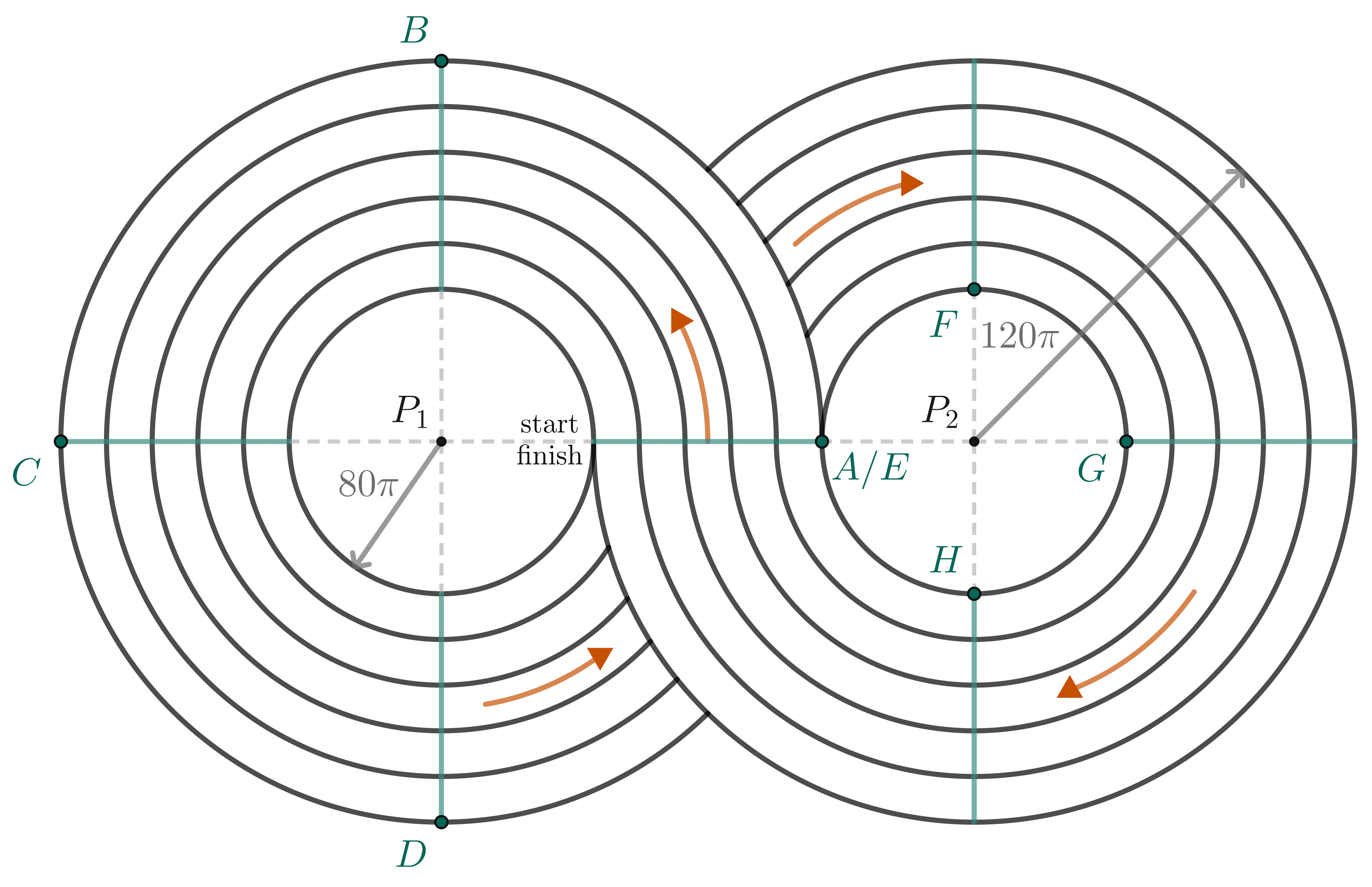 Tiap lajur lari terdiri dari dua lingkaran sehingga membentuk seperti angka delapan dengan radius $R_1$ dan $R_2$. Lingkaran dengan radius $R_1$ berpusat di $P_1$ dan lingkaran dengan radius $R_2$ berpusat di $P_2$. Diketahui setiap lajurnya memiliki jari-jari sebagai berikut: