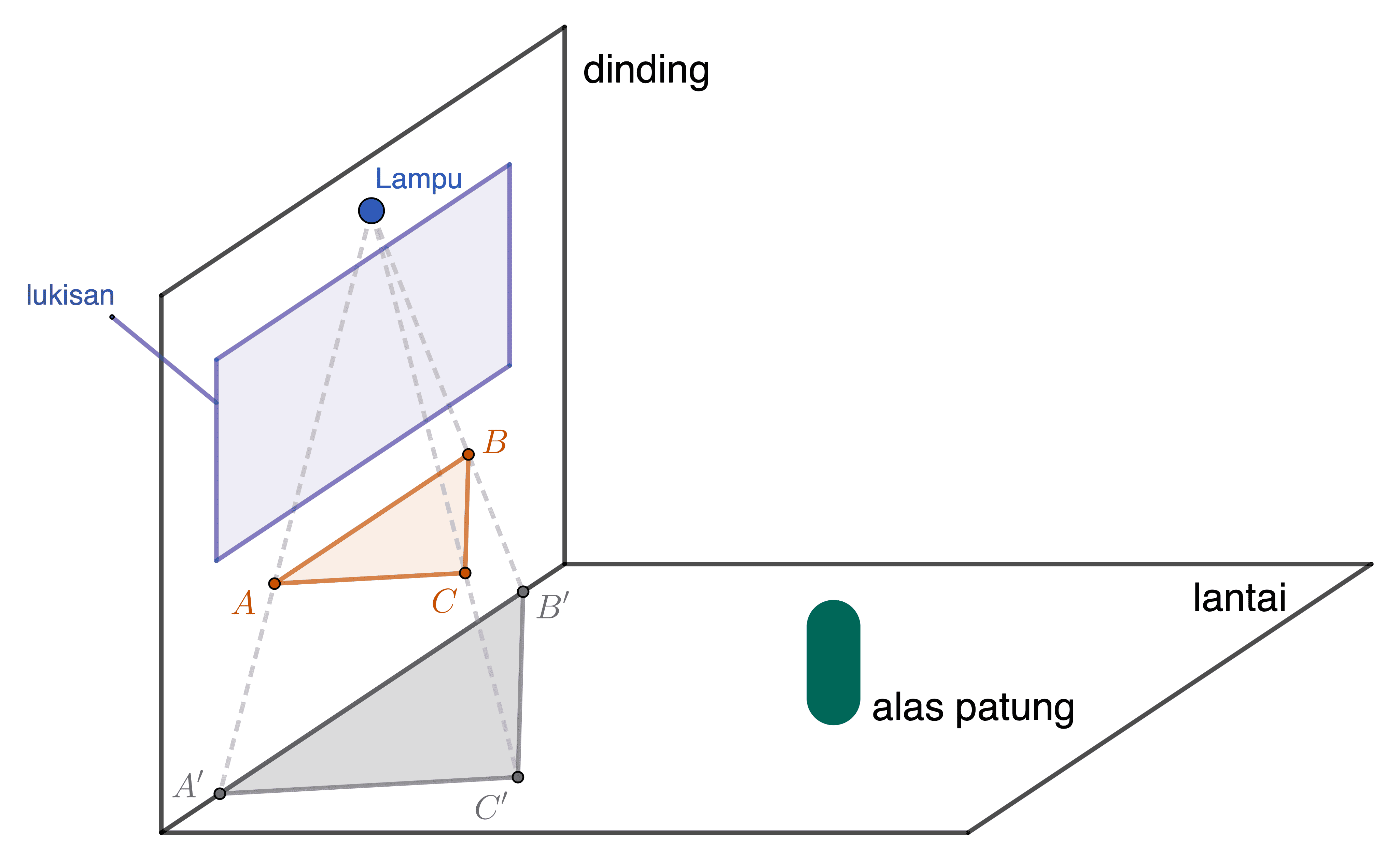 Pada dinding suatu ruangan dipasang lampu dengan ketinggian 4 m dari lantai ruangan. Sebuah meja berbentuk segitiga $ABC$ ditempatkan di bawah lampu dengan titik $A$ dan $B$ menempel pada dinding. Panjang sisi $AB$ adalah 1 m dan bayangannya di lantai adalah $A'B'$ dengan panjang $\dfrac{5}{3}$ m.