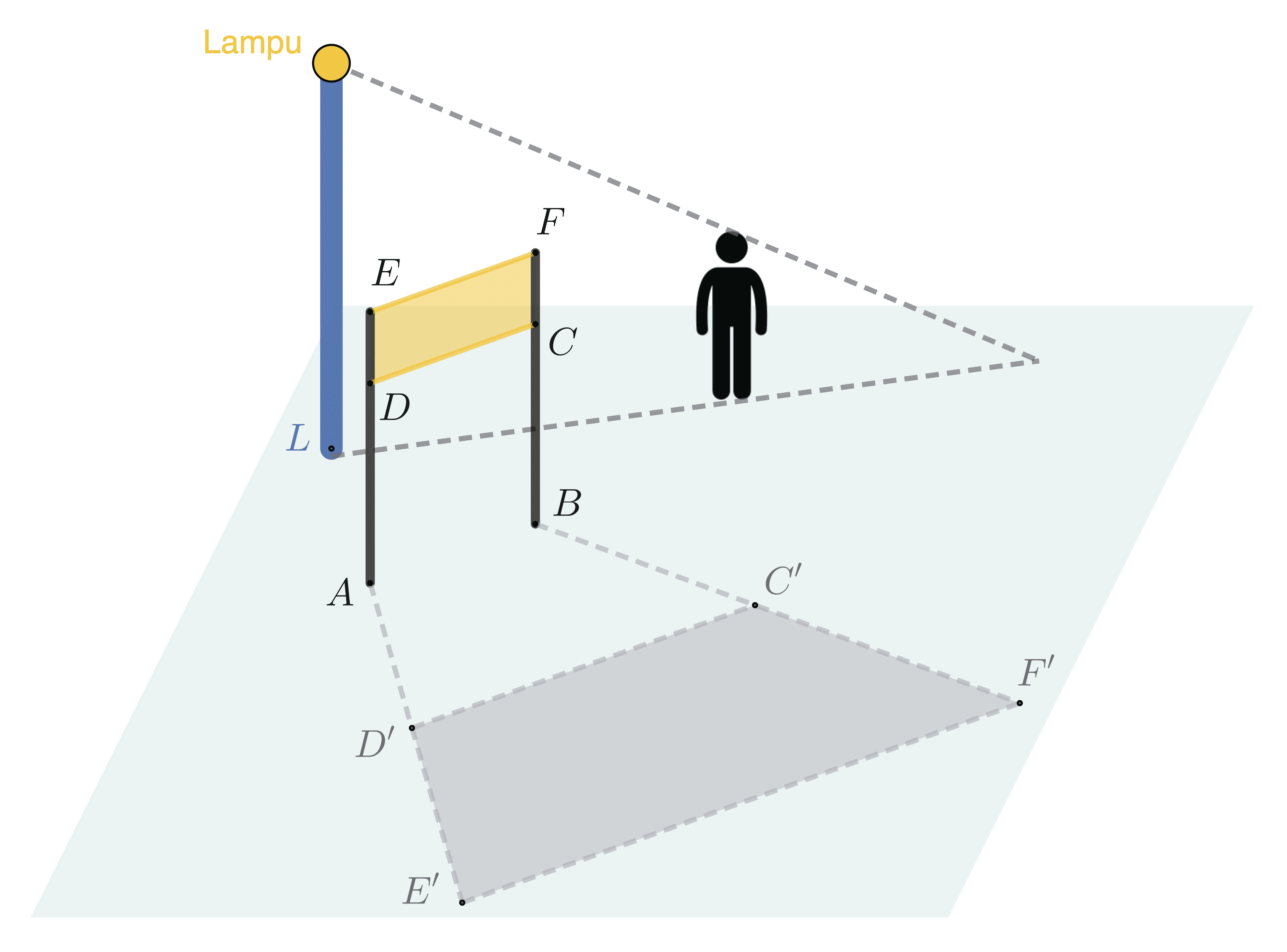 Jika luas meja adalah $\pu{0,5 m^2}$, luas bayangan meja di lantai adalah ... $\pu{m^2}$.