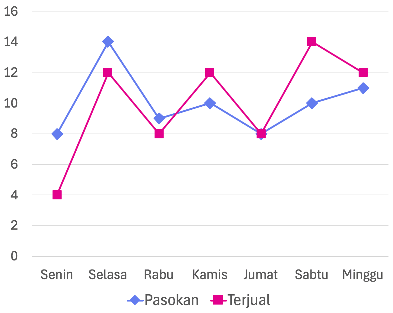 Pada suatu grosir kelontong, dijual sembilan bahan pokok makanan. Salah satu barang yang dijual oleh pedagang grosir tersebut adalah gula pasir (dalam satuan kuintal). Data pasokan dan yang terjual tiap hari dalam satu minggu disajikan dalam diagram berikut.